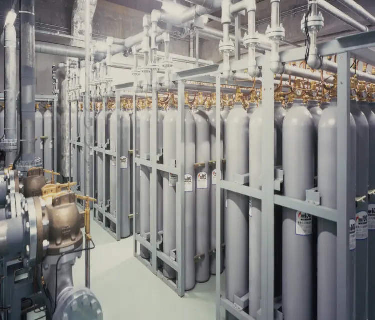 供給装置とは、高圧ガス容器に貯蔵されている高圧の水素・炭酸ガスを所要の圧力まで下げ、発電機に対し一定の圧力で継続的に供給するもの。その最大のポイントは圧力調整弁にあり、大流量を確保し確実に一定の圧力を維持することが可能な当社独自の圧力調整弁(R-10C型)を開発。供給装置第1号には、CO₂気化器(第1世代)が組み込まれ、発電所に納入された。