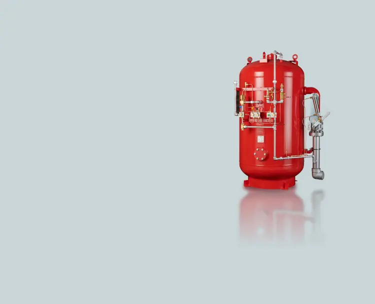 基本的な消火原理は消火器と変わりませんが、当社で扱う粉末消火設備は固定式で、移動はできません。大型の貯蔵タンク、窒素ガス加圧容器、圧力調整器、各種バルブ類などで構成されています。 -