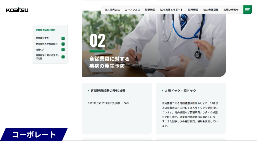 今回のコーポレートサイトから新規登場した『健康経営』に関するページです!コーアツは昔から社員の健康のために手厚く対応してきましたが、細かく学生の皆さんにお伝えする機会がありませんでした。社員の健康と会社発展の相関は強く、当社の企業実績は会社の社員一人一人に対する健康への想いが結実したものでもあります!!