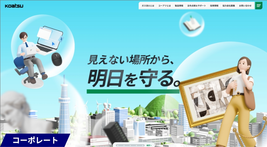 なんてったって、コーポレートのTOPページ!可愛い絵のタッチと、コーアツが守るべきお客様の財産や「こんなところにコーアツ」の街並みがドンっと表現されています。是非、下にスクロールして最後までご覧ください!